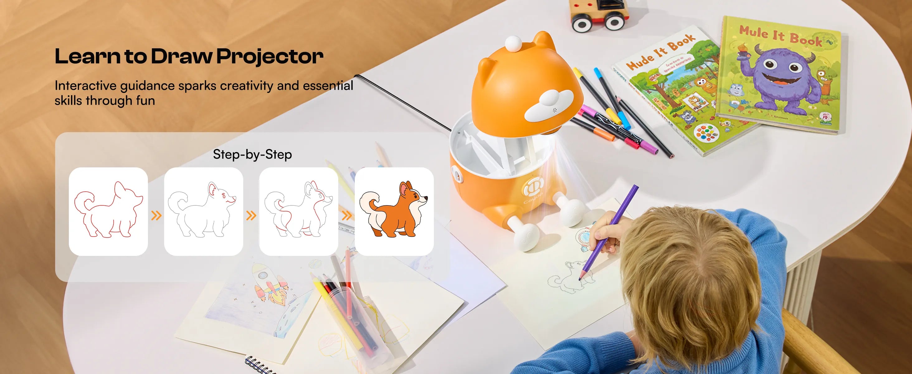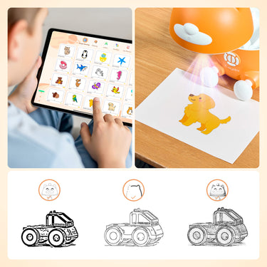 Download and install the Caydo Art Design App, take a photo of your child, and choose to convert it into detailed lines, bold lines, or cartoon-style tracing patterns. Then, use the projector for drawing practice.