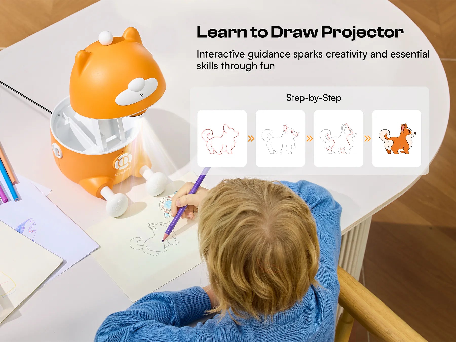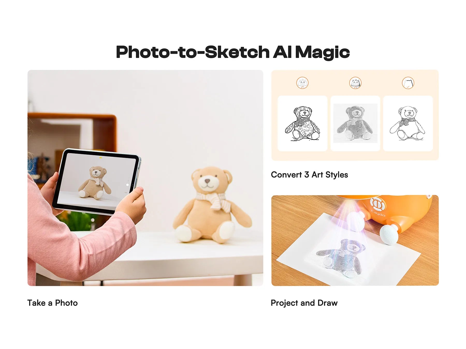 The app transforms it into 3 kid-friendly drawing styles, then projects a clear, easy-to-follow guide they can trace and color on any surface.