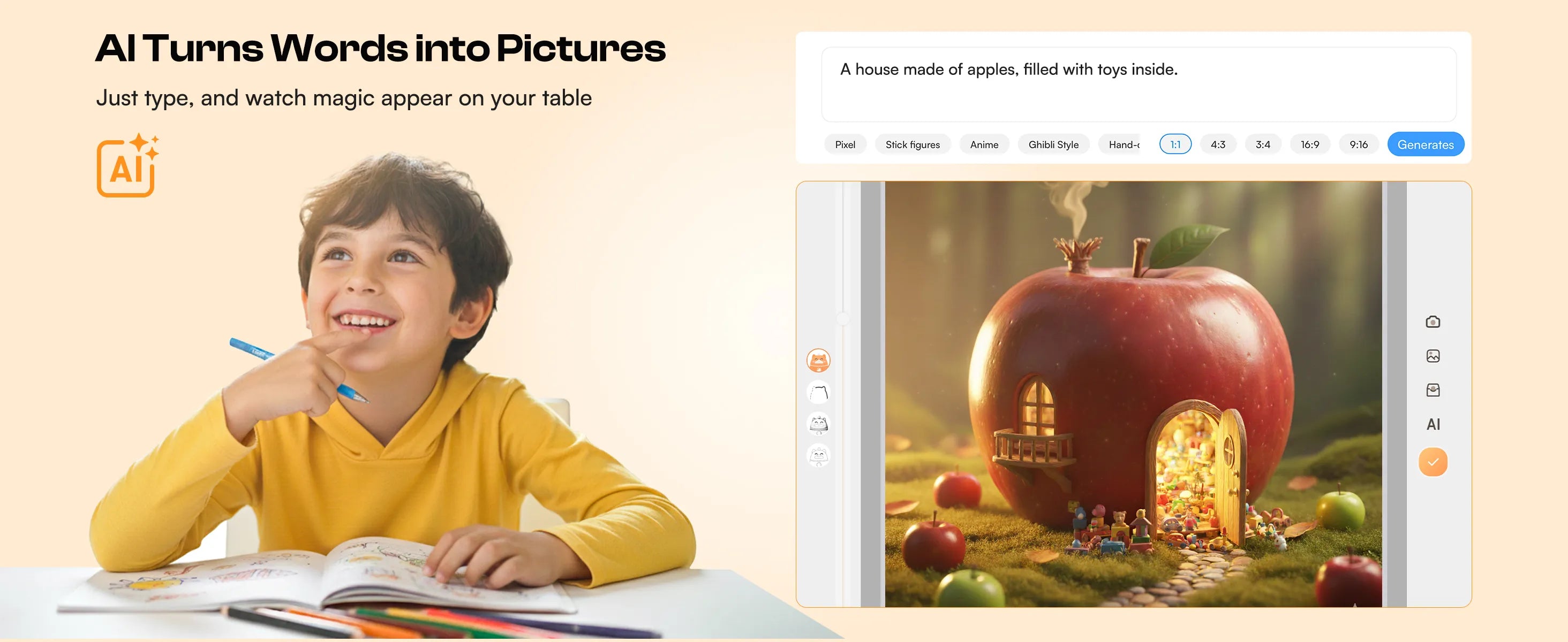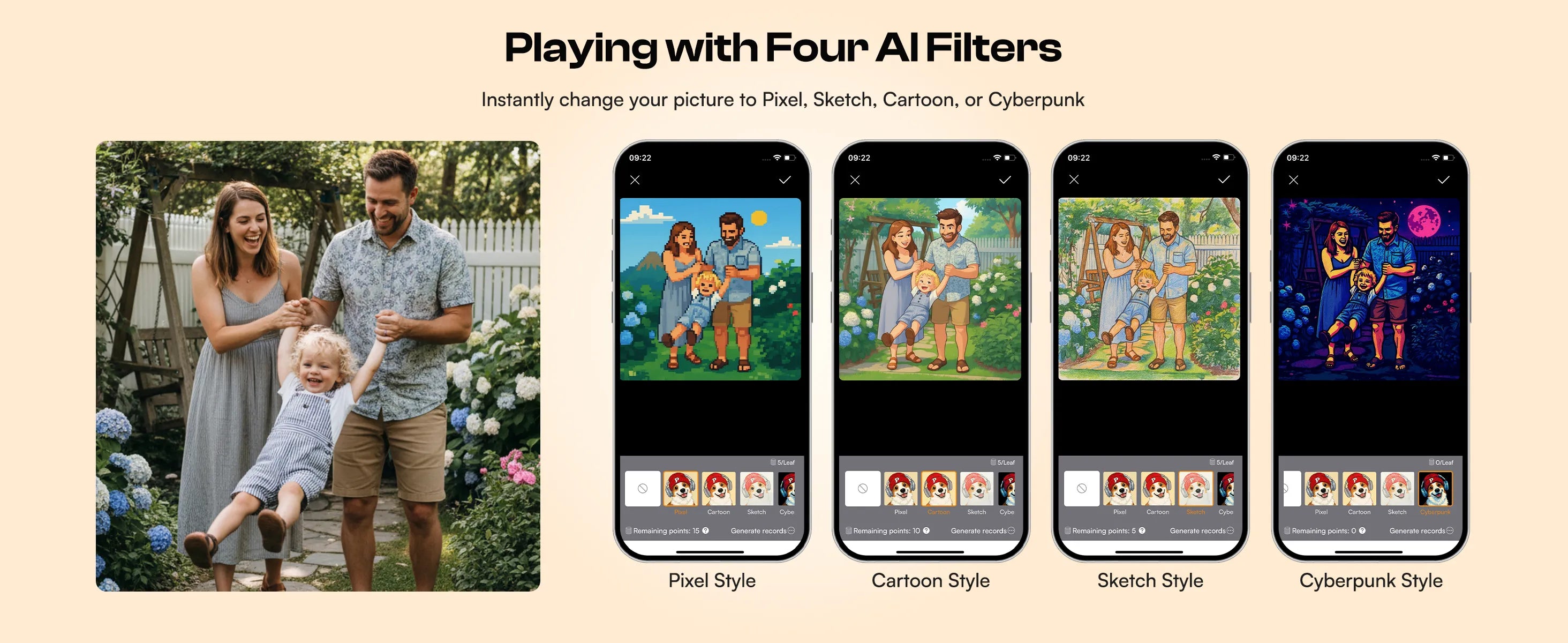Kids can also remix their own photos with fun styles like Sketch, Cartoon, Pixel, or Cyberpunk, making every creation feel personal and exciting.
