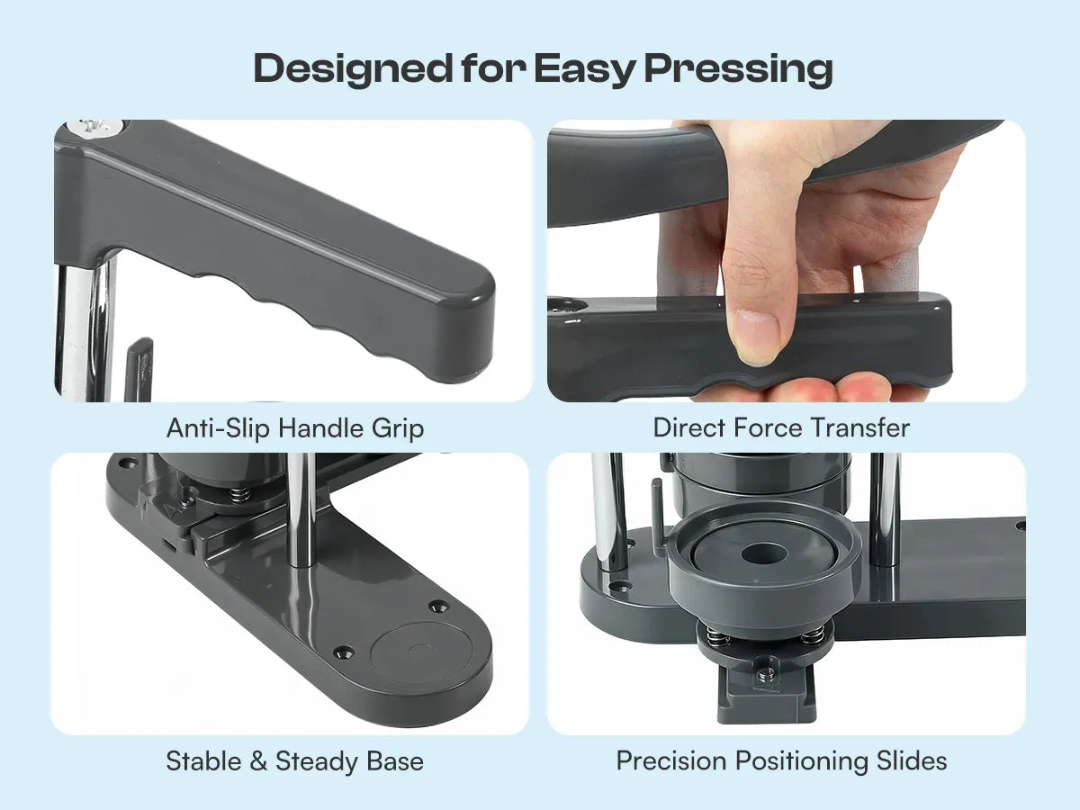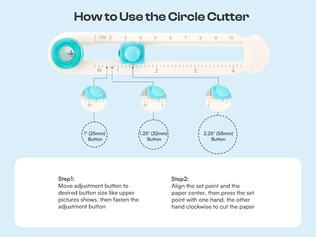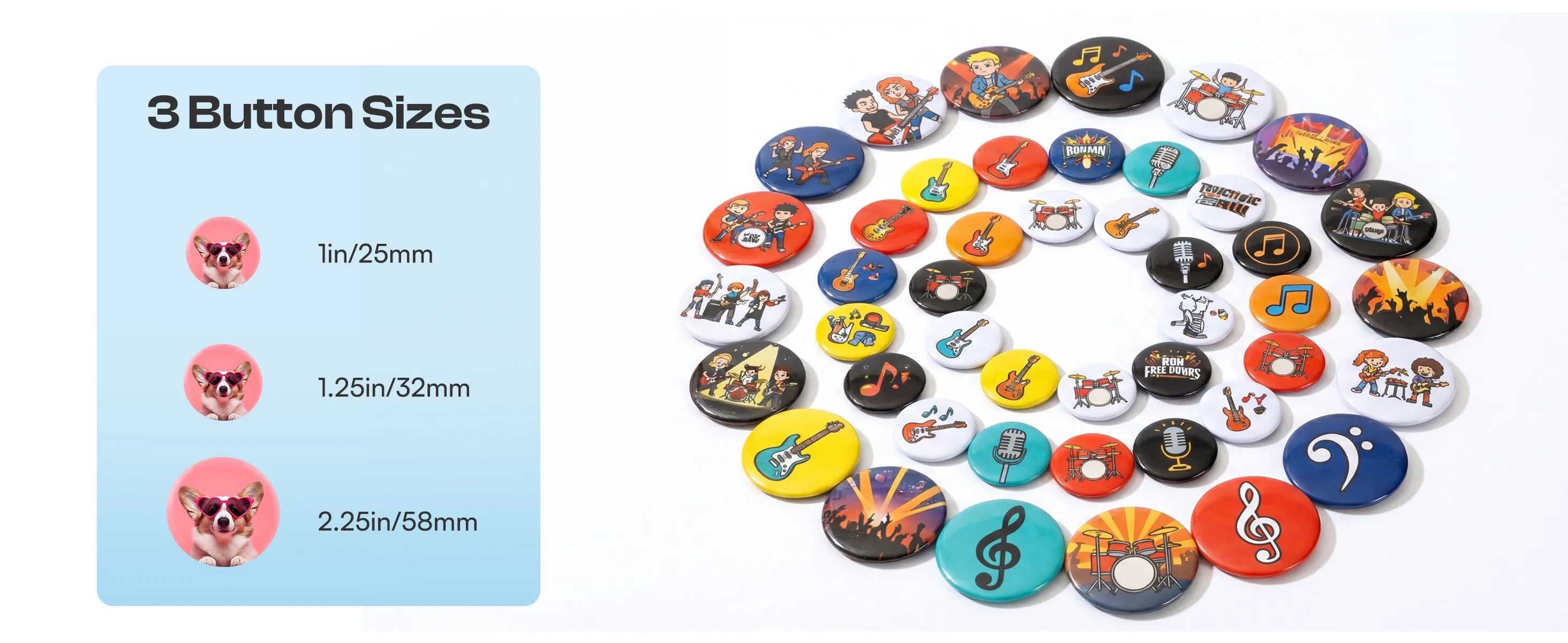 This 3-in-1 button maker includes interchangeable 1" (25mm), 1.25" (32mm), and 2.25" (58mm) molds, so one machine can handle small giveaways, everyday badges, and larger statement pieces.