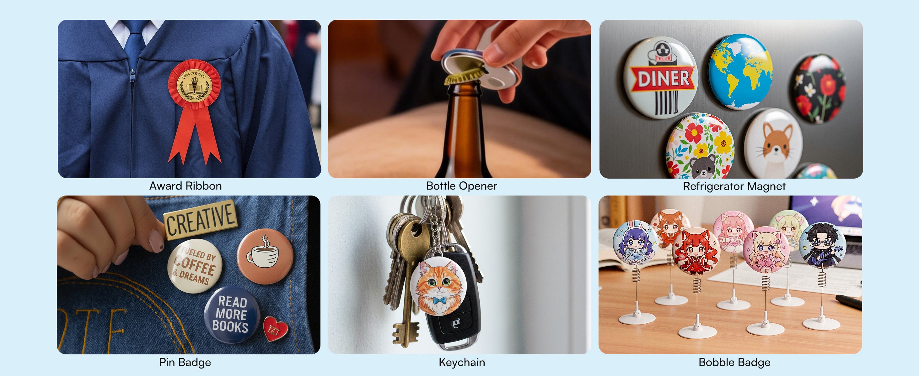 It gives you more flexibility to create custom buttons, keychains, fridge magnets, bottle openers, ribbons, and wobble badges without needing separate machines for different product types.