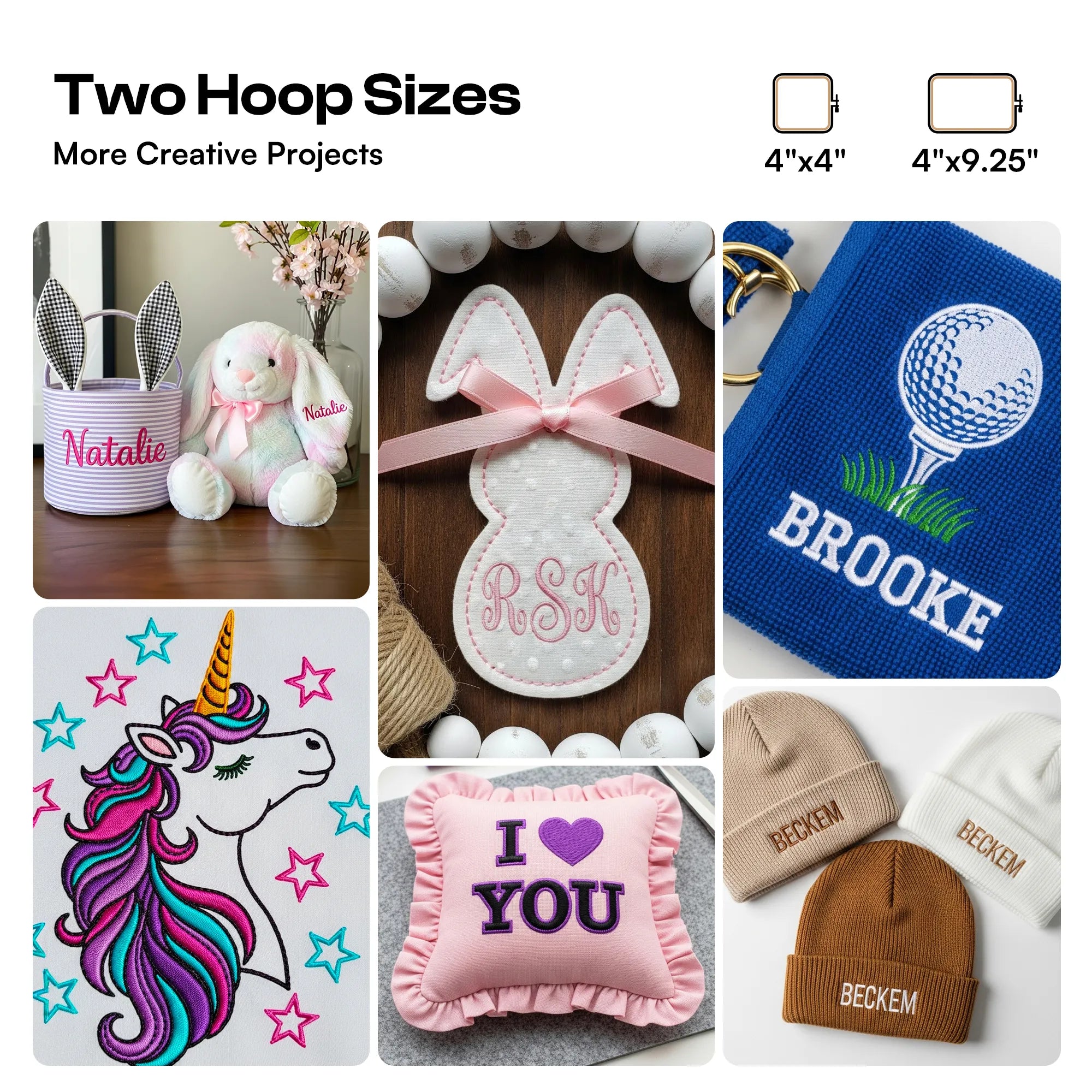 With 130 built-in embroidery designs, this upgraded model lets you personalize every project with ease. Combine letters, edit patterns, or mix designs to create truly unique results. Two embroidery hoop sizes—4"×4" and 4"×9.25"—give you the flexibility to work on everything from small details to larger statement pieces.