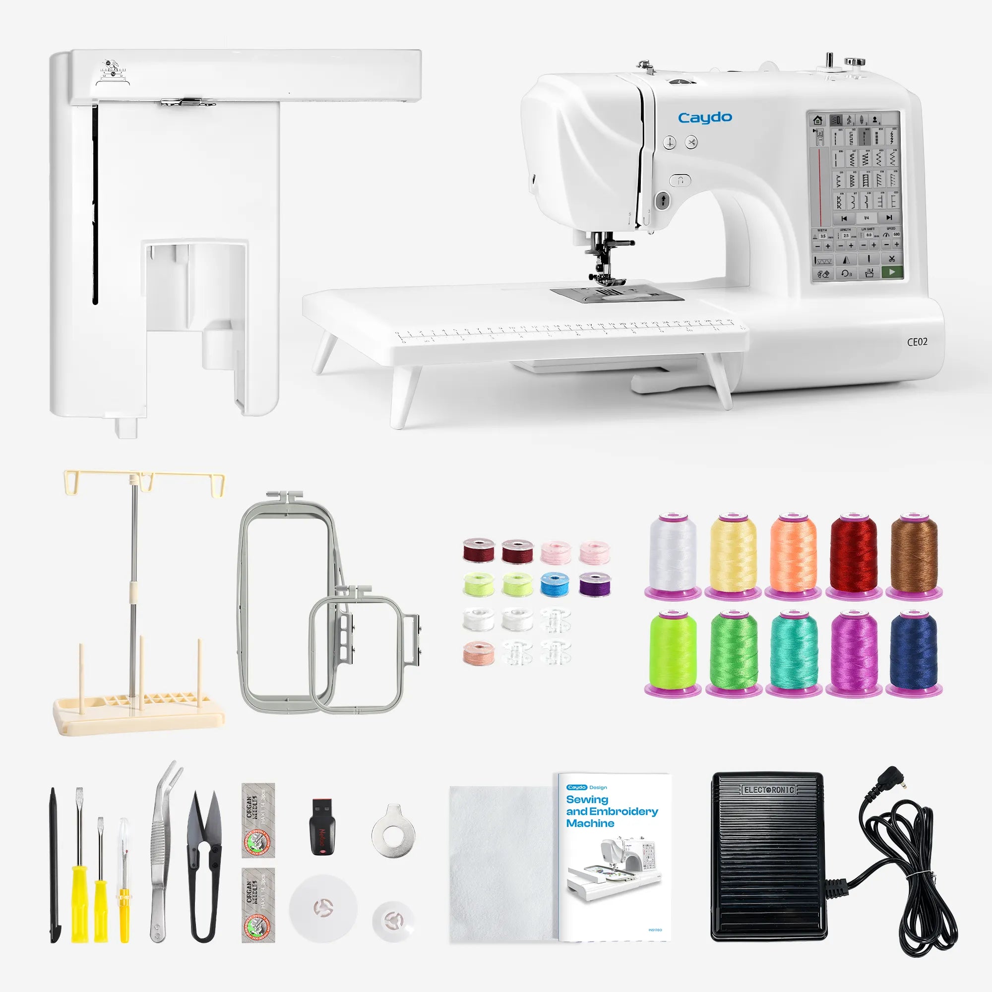 Comes fully equipped with embroidery hoops, scissors, thread spools, stabilizer sheets, and more—everything you need to start stitching immediately. Unlike other machines that require separate purchases, Caydo saves you time and money.