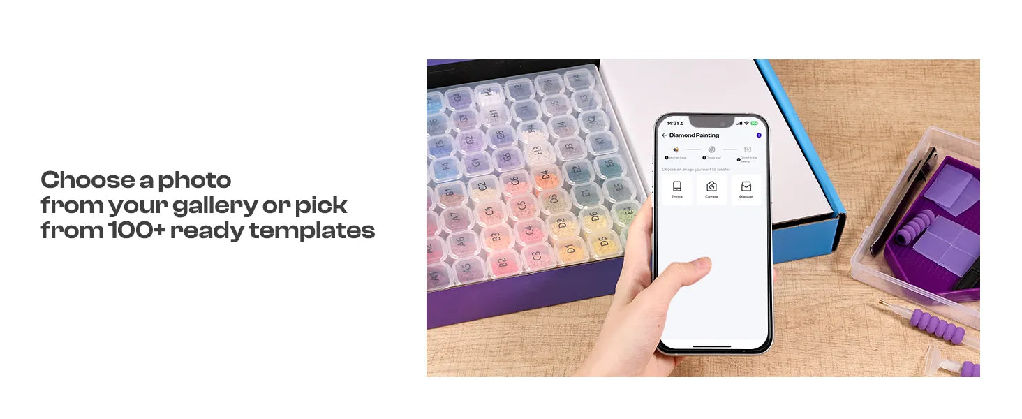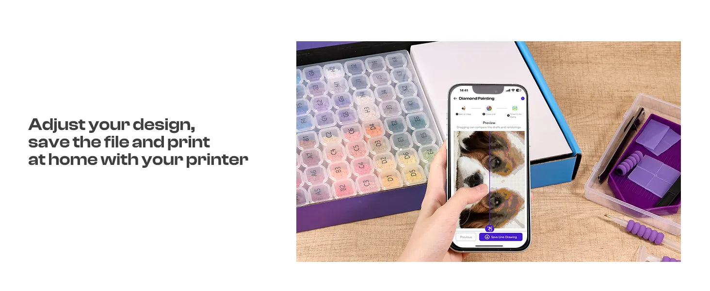 With the Design App, you can turn your own image into a personalized diamond painting pattern, preview it, adjust it, and print it at home with a home inkjet printer.
