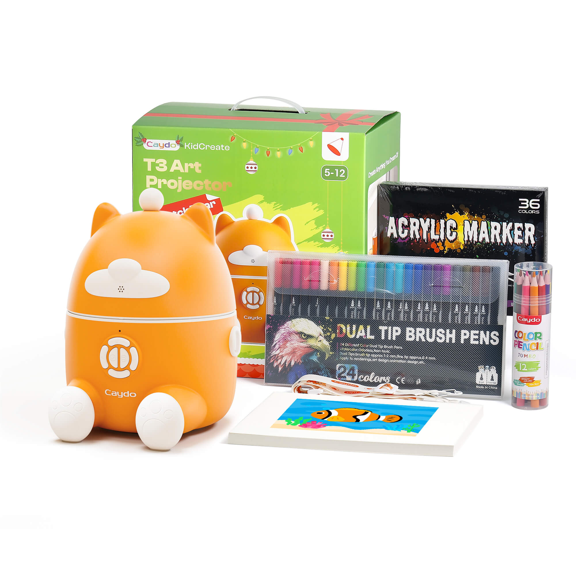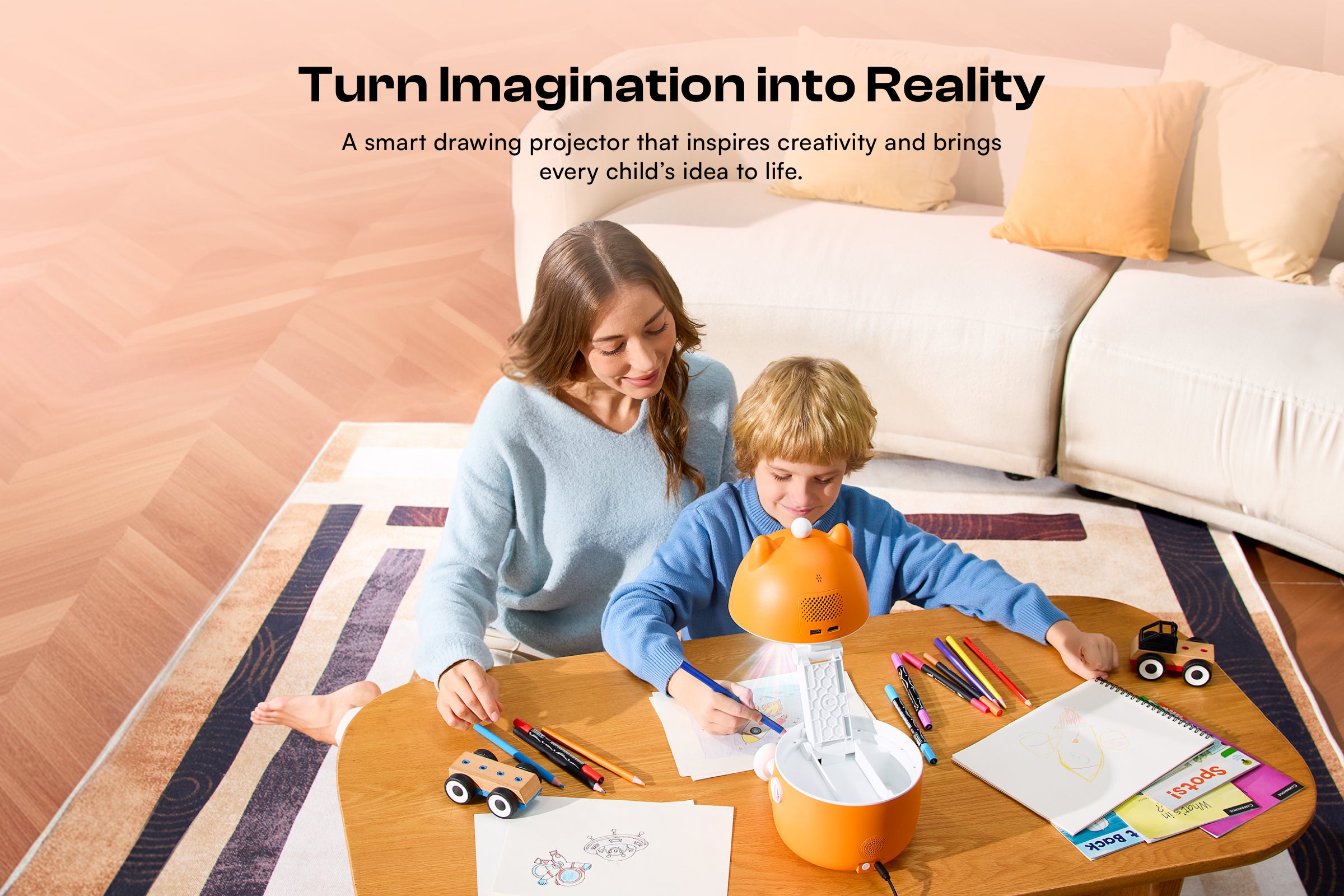 Download and install the Caydo Art Design App, take a photo of your child, and choose to convert it into detailed lines, bold lines, or cartoon-style tracing patterns. Then, use the projector for drawing practice.